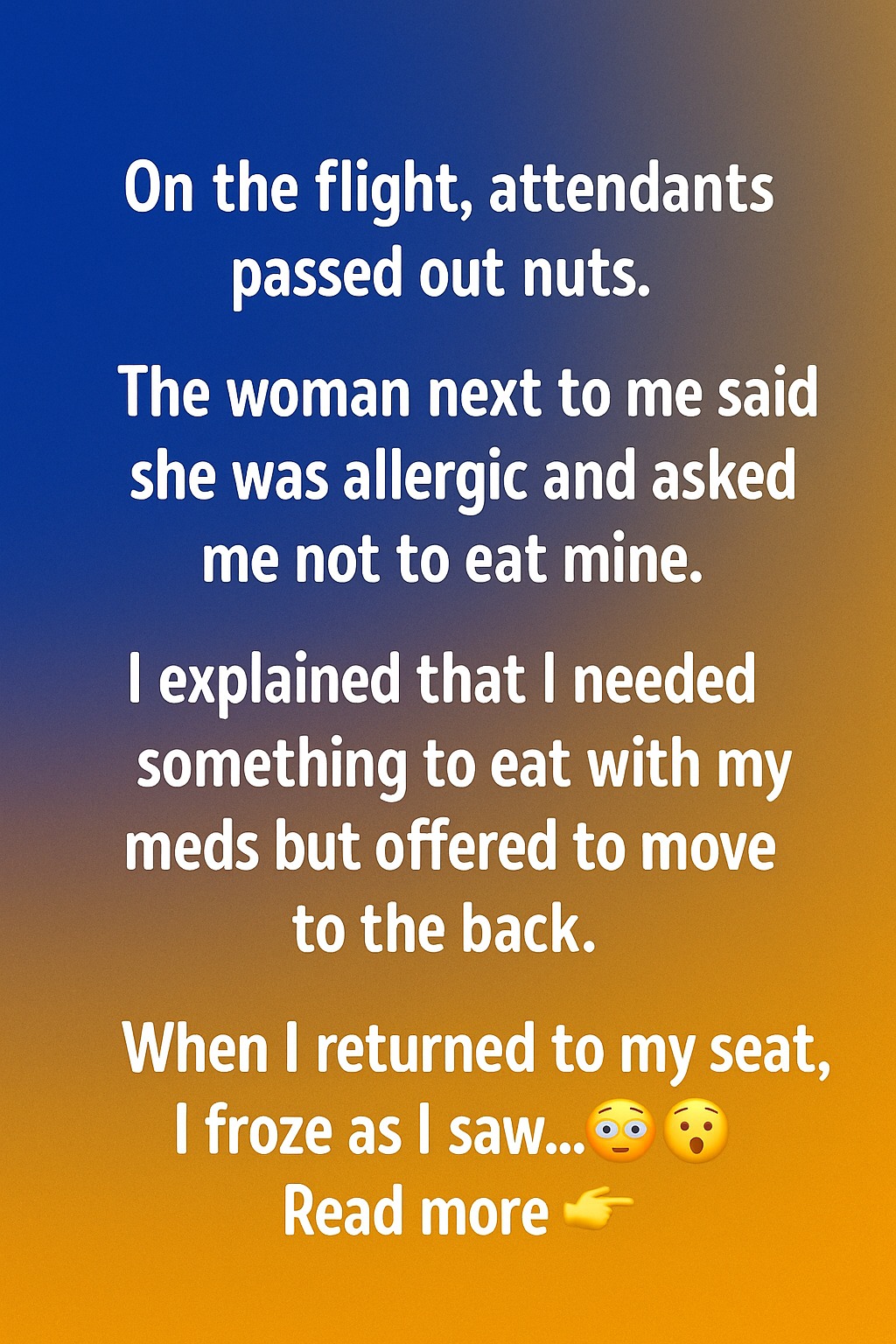 On the flight, attendants passed out nuts. The woman next to me said she was allergic and asked me not to eat mine. I explained that I needed something to eat with my meds but offered to move to the back. When I returned to my seat, I froze as I saw the little snack bag—mine—still sitting there unopened. On her tray was something else: a pack of cookies. She must have quietly asked the attendant for a substitute. When our eyes met, she gave me a small, almost shy smile.