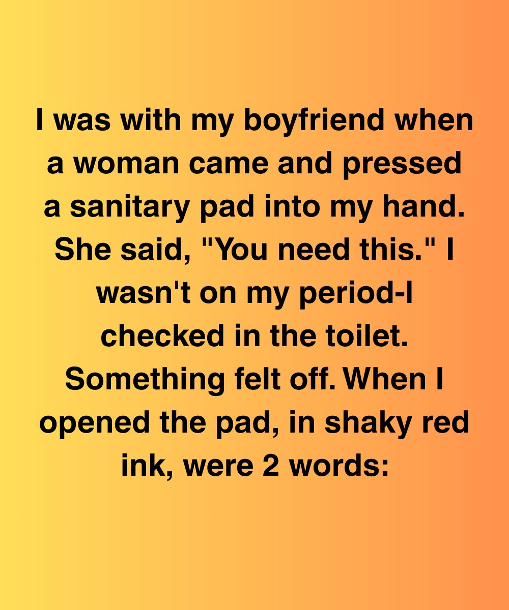 I stood there with the pad in my palm, heartbeat tapping at my throat. A second passed, then a strange, skittering instinct: open it. The wrapper crackled. The pad unfurled. In shaky red ink, two words bled through the cotton: