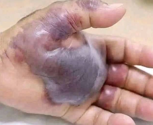 If you ever notice swelling, intense pain, or discoloration like this after a bite or injury, seek emergency medical help IMMEDIATELY.Delaying treatment can lead to permanent tissue damage—or worse.