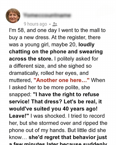 All I wanted was a dress for my son’s wedding. With just two weeks left, I wandered store after store, frustrated and empty-handed—until a small boutique caught my eye. Inside, elegant dresses filled the racks, but the peace was shattered by a loud young clerk on the phone, casually swearing in front of customers. When I politely asked for another size, her response was hostile. She mocked me, made ageist remarks, and shockingly yanked my phone out of my hand when I tried to document the encounter.