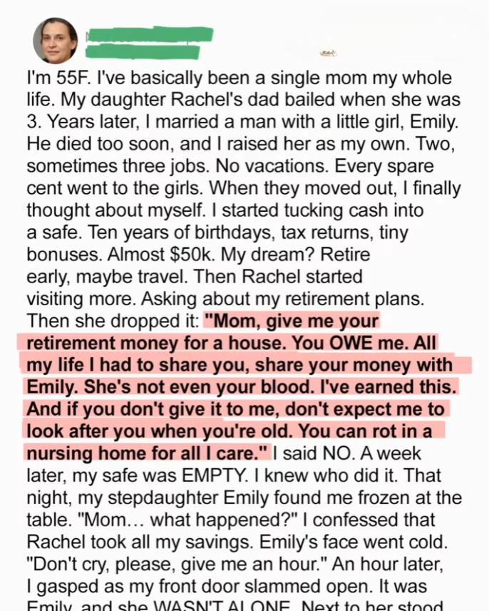 After years of hard work and sacrifice, Julie finally saved a modest amount to secure her retirement. She raised her daughter, Rachel, alone after her first husband left, later blending her family when she married Tom and became stepmother to Emily. Even after Tom’s sudden passing, Julie worked multiple jobs to give both girls a stable, loving home.