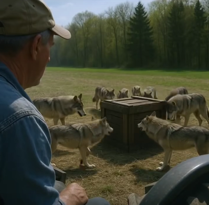 A dozen gray wolves, standing in the clearing. Their fur shimmered silver in the early sun. They weren’t hunting, weren’t feasting, weren’t fighting. They were circling something strange—something wooden and box-like. A battered crate.