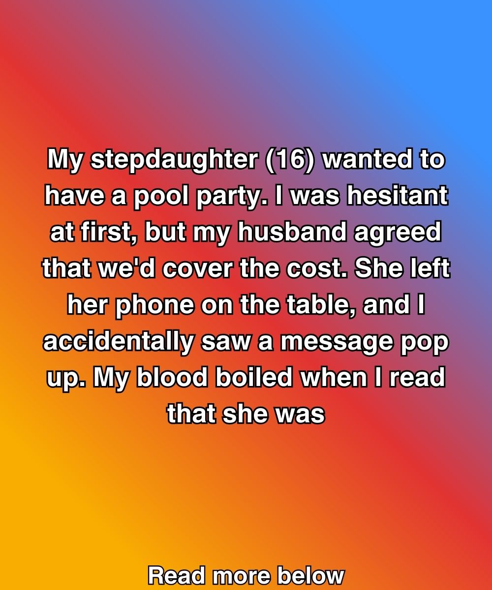 My stepdaughter (16) wanted to have a pool party. I was hesitant at first, but my husband agreed that we’d cover the cost. She left her phone on the table, and I accidentally saw a message pop up. My blood boiled when I read that she was calling me “a gold-digging loser who’s only nice so she can take Dad’s money when he dies.”