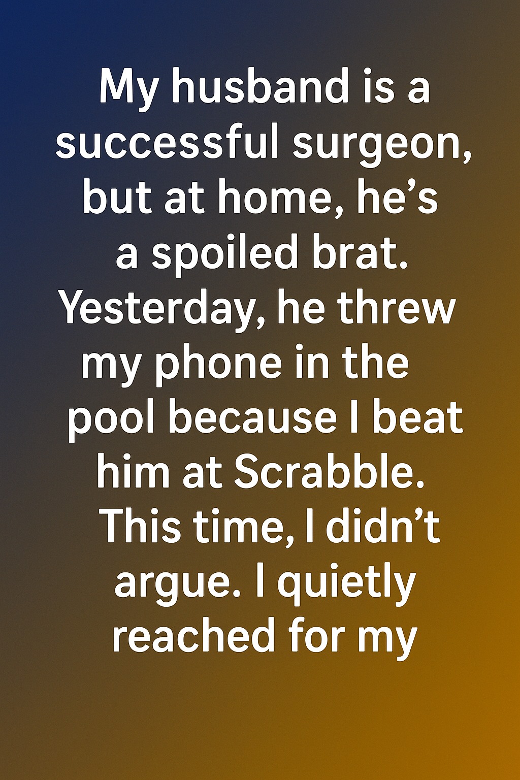 My husband is a surgeon, successful but at home, he’s a spoiled brat. Yesterday, he threw my phone in the pool because I beat him at Scrabble. This time, I didn’t argue. I quietly reached for my journal instead.You see, this wasn’t the first time he’d overreacted to something small. Usually, I would raise my voice and we’d have a long, dramatic fight.