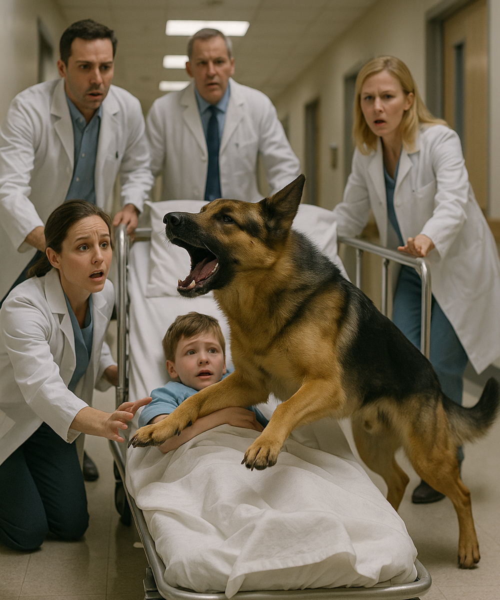 The dog moved quickly, planting himself between the hospital bed and the door. His ears were sharp, his body tense, and a low growl rose from his chest.