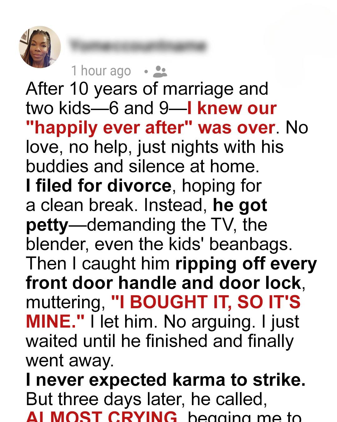 When my husband of ten years walked out, he decided to take anything he’d ever “paid for.” The TV, the blender, even the kids’ beanbags. I didn’t fight him — I’d learned by then that silence can be more powerful than any argument. The next morning, I found him with a screwdriver, removing every door handle in the house. Front door, back door, basement — all gone, dropped into a plastic bucket. “I bought them,” he said with smug satisfaction. I just let him work. If a man needs door handles to feel victorious, you’ve already won.