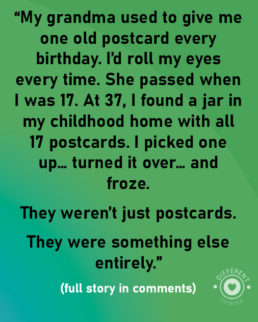 While sorting through old boxes, I stumbled across a small glass jar labeled “For You.” Inside were the 17 postcards my grandma had given me. I smiled nostalgically, but when I turned over the first card, my smile froze. There was a handwritten note on the back — and it wasn’t just a birthday message. It was a clue. One by one, I flipped through the postcards, each revealing part of a hidden story.