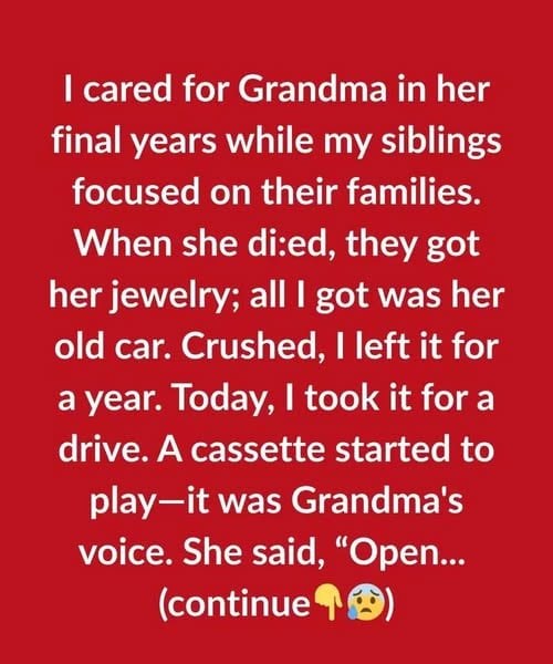 I cared for Grandma in her final years while my siblings focused on their families. When she died, they got her jewelry; all I got was her old car. Crushed, I left it for a year.