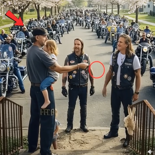 A few nights later, Adam sat at home, unpaid bills stacked on the table, when he heard it—the low rumble of engines. At first faint, then louder, until the street outside shook. Forty motorcycles lined up along the curb, chrome glinting under the dawn light. Adam froze, shielding Lily behind him.