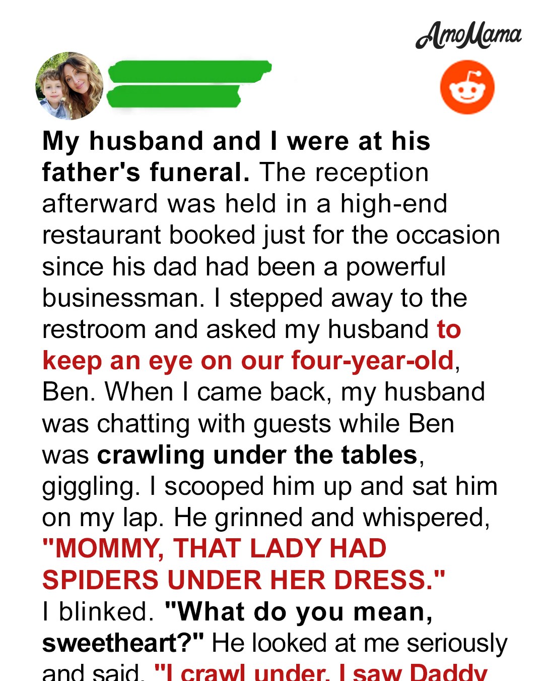 “He said she had spiders under her dress,” Ben added, wide-eyed. “But I didn’t see spiders.”