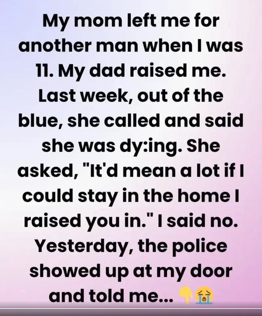 “You didn’t raise me. You left.” But the next day, police found her mother collapsed outside her door with suitcases, waiting for acceptance that never came.Guilt set in, yet she held her boundary. She had mourned her mother long ago and could not reopen those wounds. The story asks