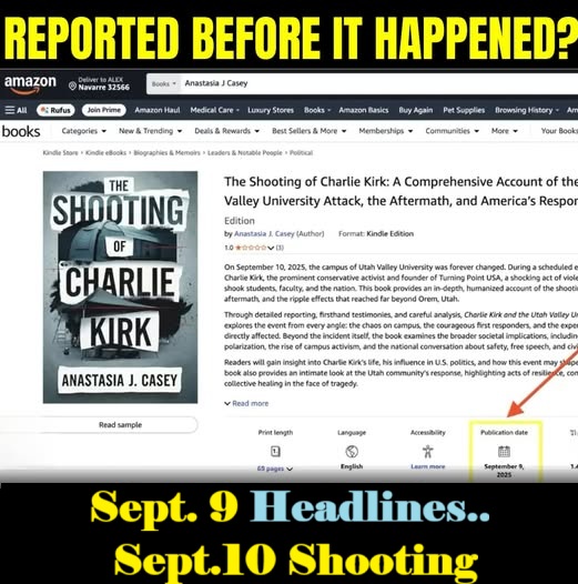 Even more bizarre — the video shows **an Amazon book titled “The Shooting of Charlie Kirk” uploaded before the killing took place.**