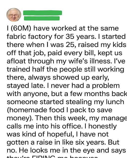 I wanted to shout, to slam my fist on his desk, to demand he reconsider. But all I could do was stand there, stunned. Thirty-five years of loyalty, wiped away in the span of five minutes, all because I dared to protect my lunch.