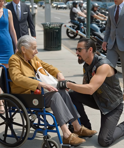 It was a man in a leather vest, tattoos down his arms, gloves worn from riding. He knelt on the pavement—not hurried, not annoyed—and tied my shoes with the care of someone handling silk.