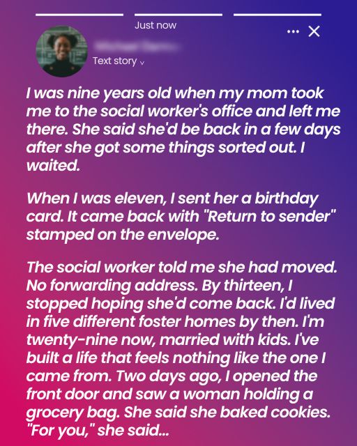 The social worker told me she had moved. No forwarding address. By thirteen, I stopped hoping she’d come back. I’d lived in five different foster homes by then. I’m twenty-nine now, married with kids. I’ve built a life that feels nothing like the one I came from. Two days ago, I opened the front door and saw a woman holding a grocery bag. She said she baked cookies. “For you,” she said.