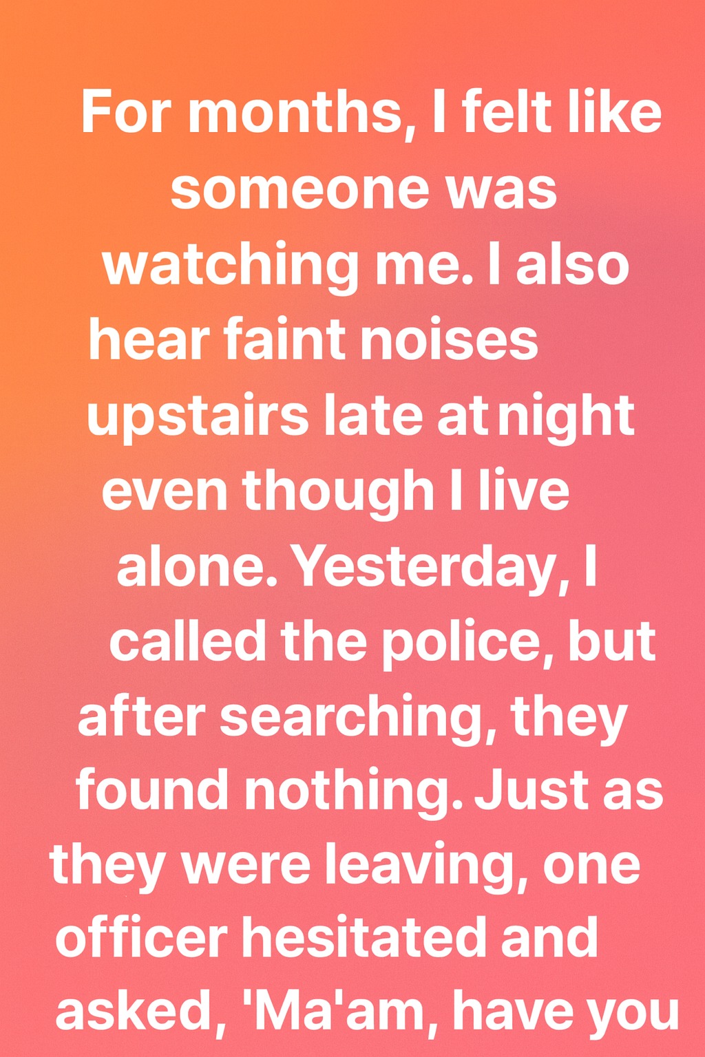 For months, I felt like someone was watching me. I also heard faint noises upstairs late at night, even though I lived alone. Yesterday, I finally called the police. After searching the entire house, they found nothing. Just as they were leaving, one officer hesitated at the door and asked, “Ma’am, have you noticed anything missing or out of place lately?”