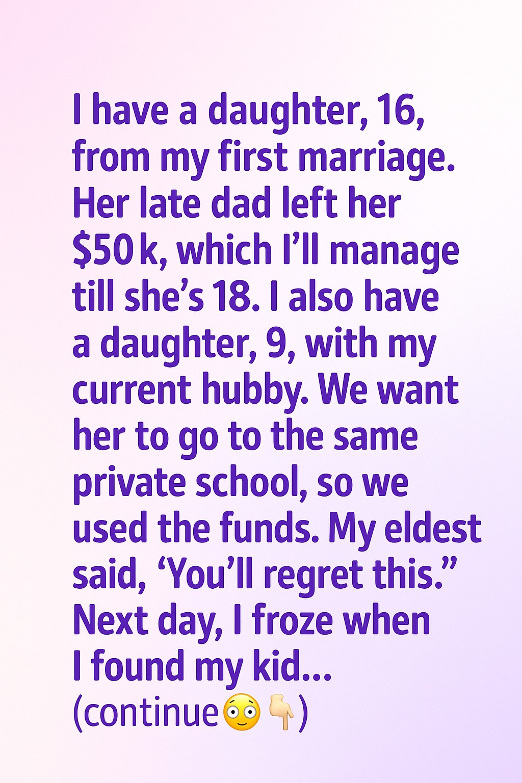 I have a daughter, 16, from my first marriage. Her late dad left her $50k, which I’ve been managing for her until she turns 18. I also have a younger daughter, 9, with my current husband. We wanted our youngest to attend the same private school as her sister to give them both equal opportunities. Since we were struggling financially, we decided to use some of the money her late father had left behind.