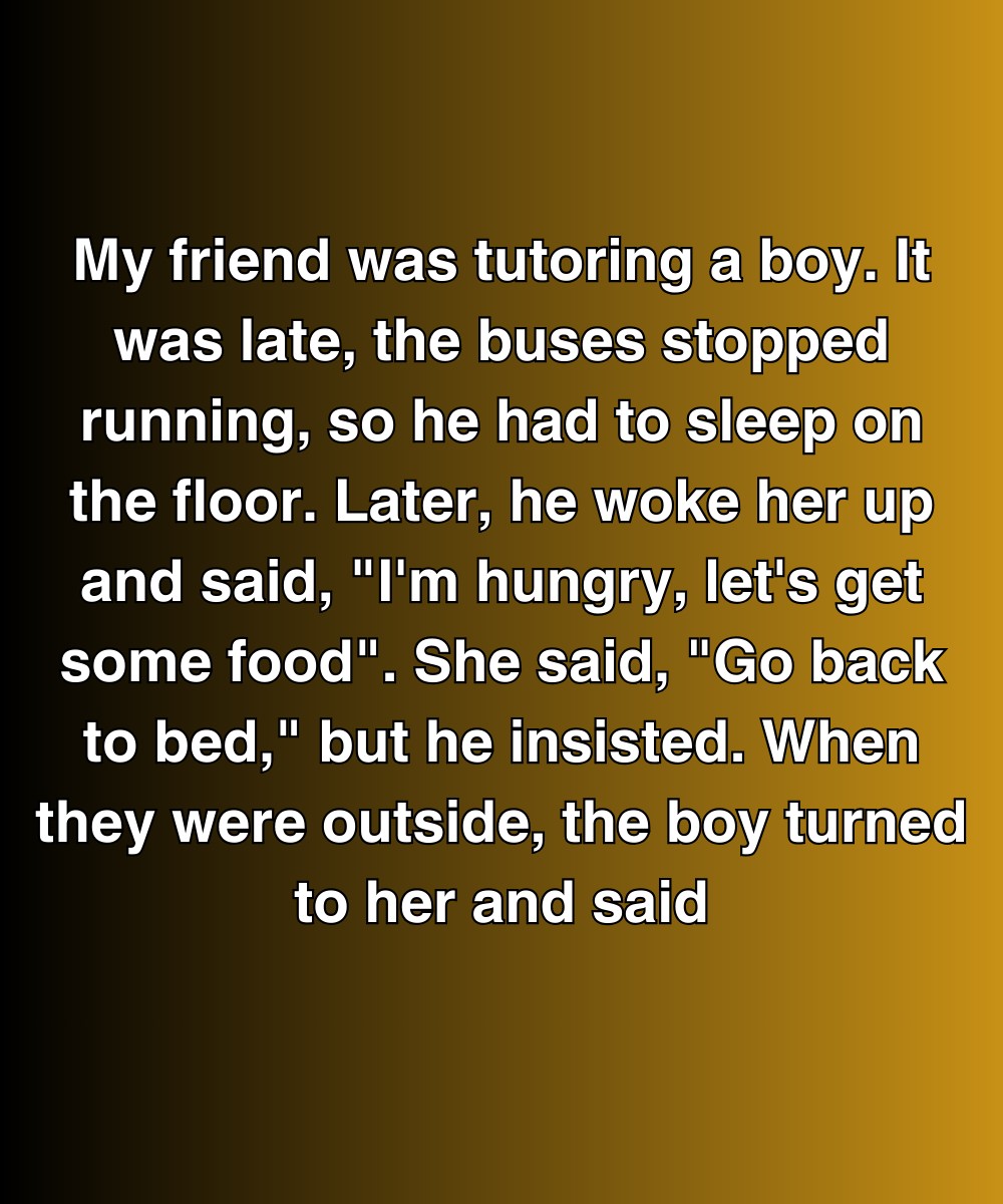 My friend was tutoring a boy. It was late, the buses stopped running, so he had to sleep on the floor. Later, he woke her up and said, “I’m hungry, let’s get some food.” She said, “Go back to bed,” but he insisted. When they were outside, the boy turned to her and said, “I lied. I didn’t bring money. I thought maybe you’d treat me. Please don’t be mad.”