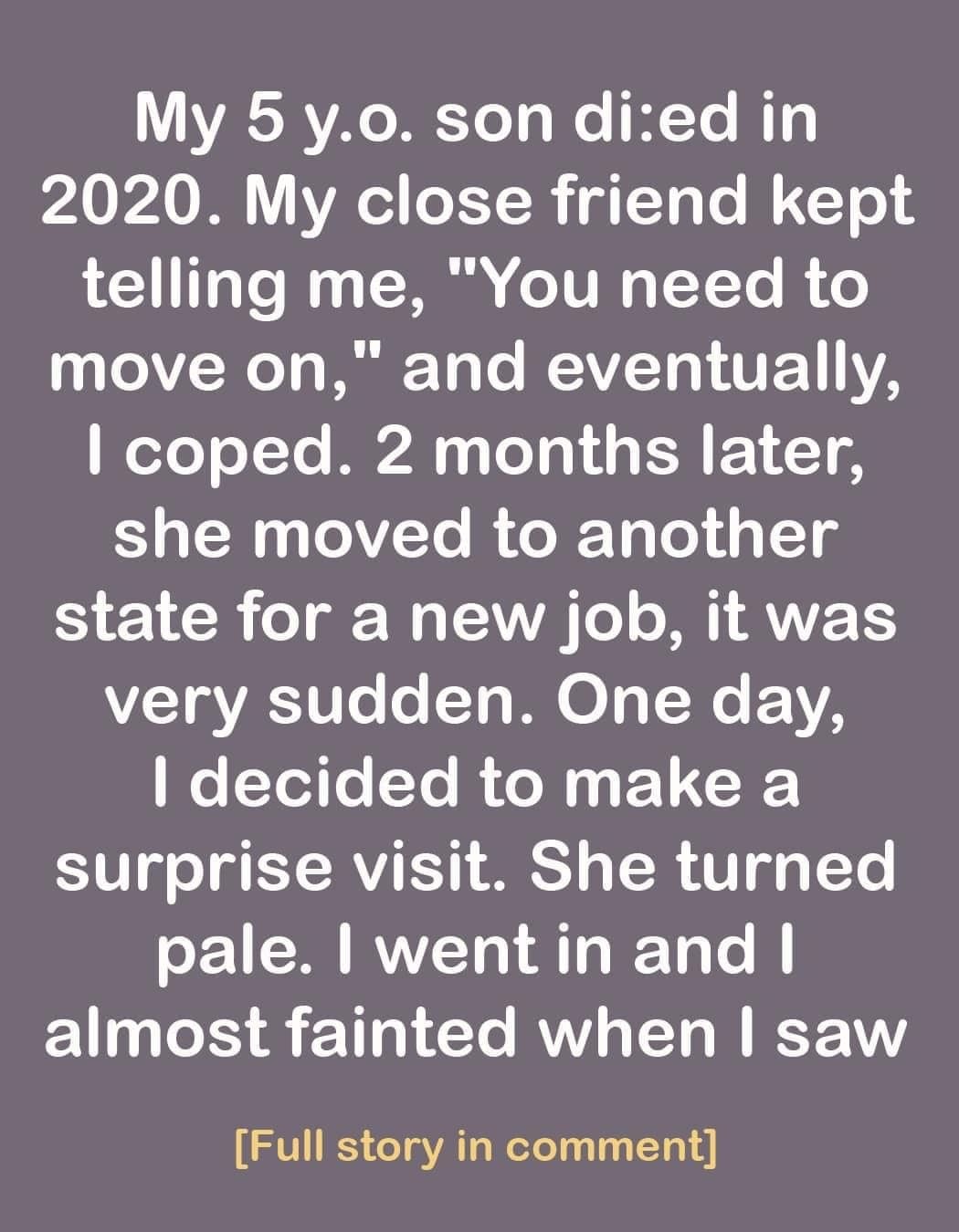 My 5 y.o. son died in 2020. My good friend kept telling me, “You need to move on,” and eventually, I coped. 2 months later, she moved to another state for a new job, it was very sudden. One day, I decided to make a surprise visit. When she saw me, she turned pale. I went in and I almost fainted when I saw my son’s photos covering all her walls. Some of them, I couldn’t even recall sharing with her. Then, to my shock, I found some of his clothes on her sofa, alongside a box containing his shoes and socks. The whole scene felt disturbingly eerie.