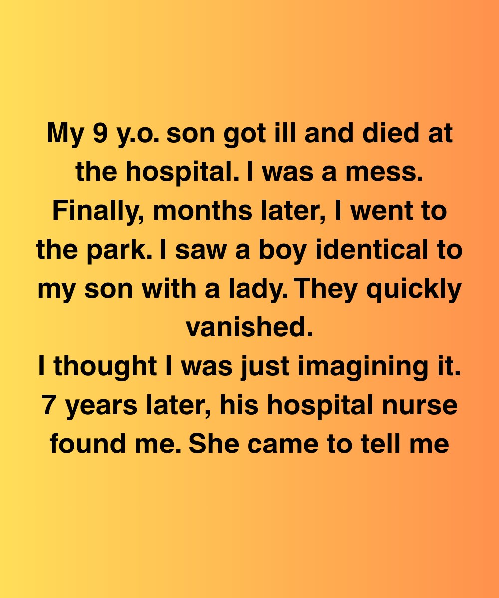 My 9 y.o. son got ill and died at the hospital. I was a mess. Finally, months later, I went to the park. I saw a boy identical to my son with a lady. They quickly vanished.