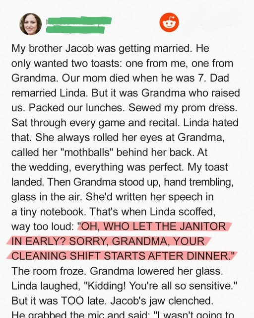 At the wedding, everything was perfect. My toast landed. Then Grandma stood up, hand trembling, glass in the air. She’d written her speech in a tiny notebook. That’s when Linda scoffed, way too loud: ‘OH, WHO LET THE JANITOR IN EARLY? SORRY, GRANDMA, YOUR CLEANING SHIFT STARTS AFTER DINNER.’