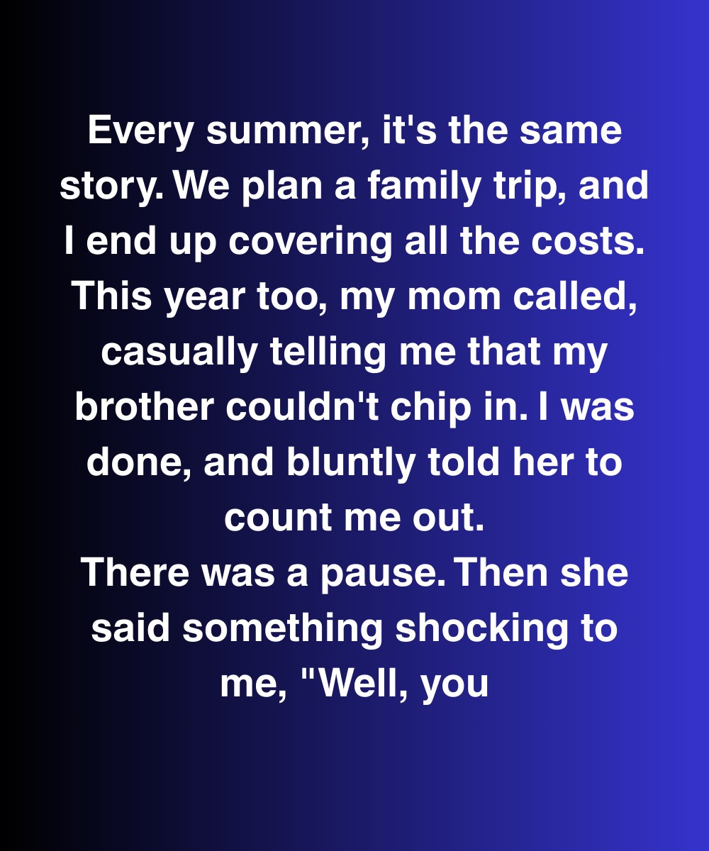 Every summer, it’s the same story. We plan a family trip, and I end up covering all the costs. This year too, my mom called, casually telling me that my brother couldn’t chip in. I was done, and bluntly told her to count me out.