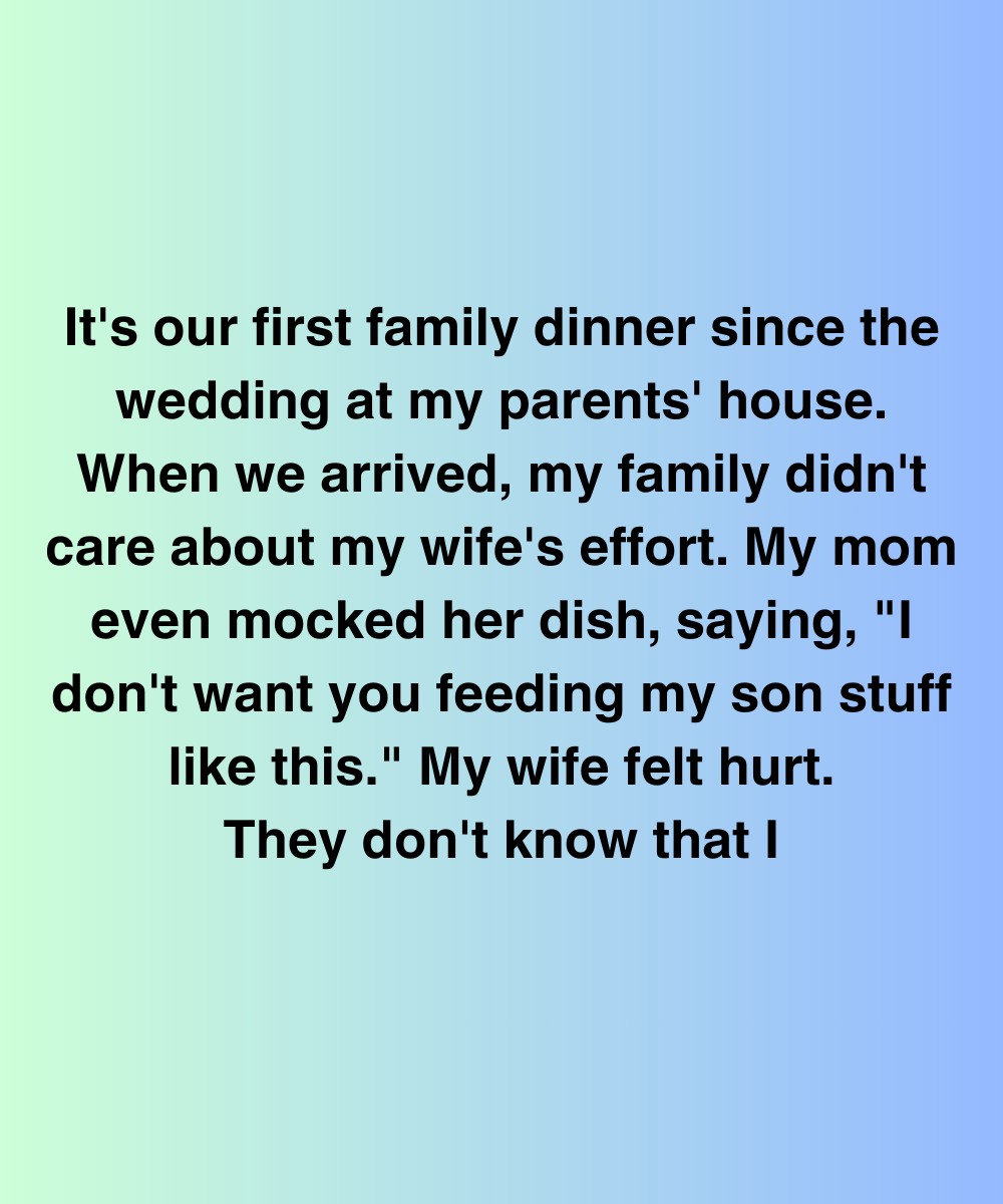 “It’s our first family dinner since the wedding at my parents’ house. When we arrived, my family didn’t care about my wife’s effort. My mom even mocked her dish, saying, ‘I don’t want you feeding my son stuff like this.’ My wife felt hurt. They don’t know that I…”
