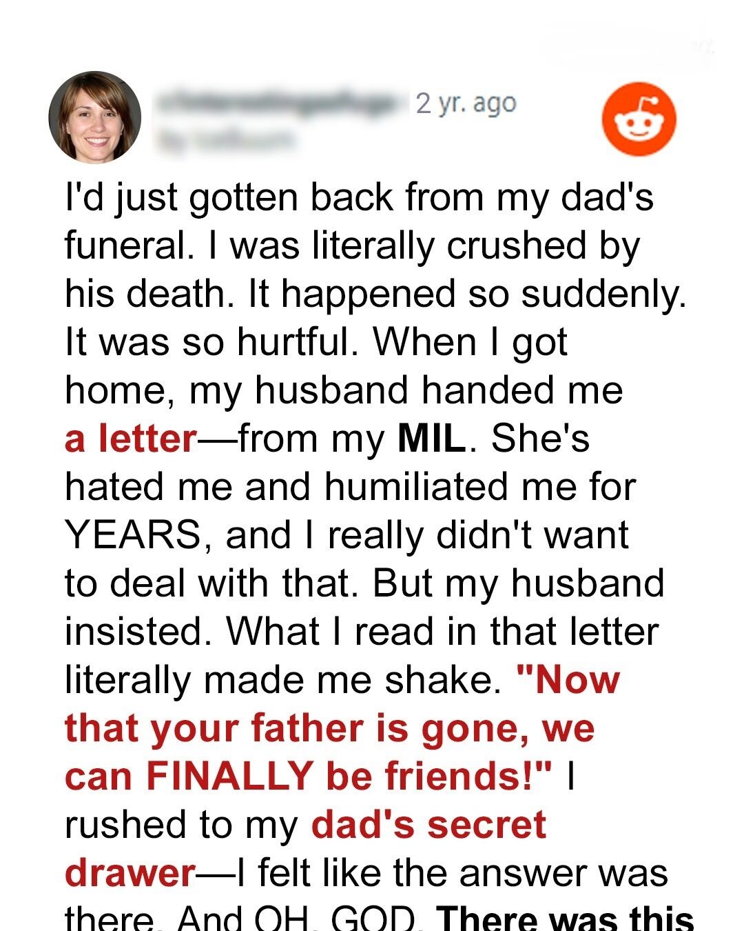 I’d just gotten back from my dad’s funeral. I was literally crushed by his death. It happened so suddenly. It was so hurtful. When I got home, my husband handed me a letter—from my MIL. She’s hated me and humiliated me for YEARS, and I really didn’t want to deal with that. But my husband insisted. What I read in that letter literally made me shake.