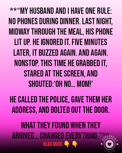 Husband and I have a rule: no checking our phones during dinner. Last night, halfway through the meal, his phone lit up. He glanced at it but continued eating. Five minutes later, it buzzed again, repeatedly. This time, he picked up and yelled, “OH NO! MOM!” He then called the police, gave them his mom’s address and ran out. Turned out she had slipped in her kitchen, knocked her head, and couldn’t move. Her neighbor had found her struggling and was calling from her phone.