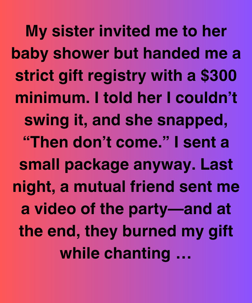 My sister invited me to her baby shower but handed me a strict gift registry with a $300 minimum. I told her I couldn’t swing it, and she snapped, “Then don’t come.” I sent a small package anyway. Last night, a mutual friend sent me a video of the party—and at the end, they burned my gift while chanting something cruel that I still can’t shake: “If she can’t pay, throw it away!”