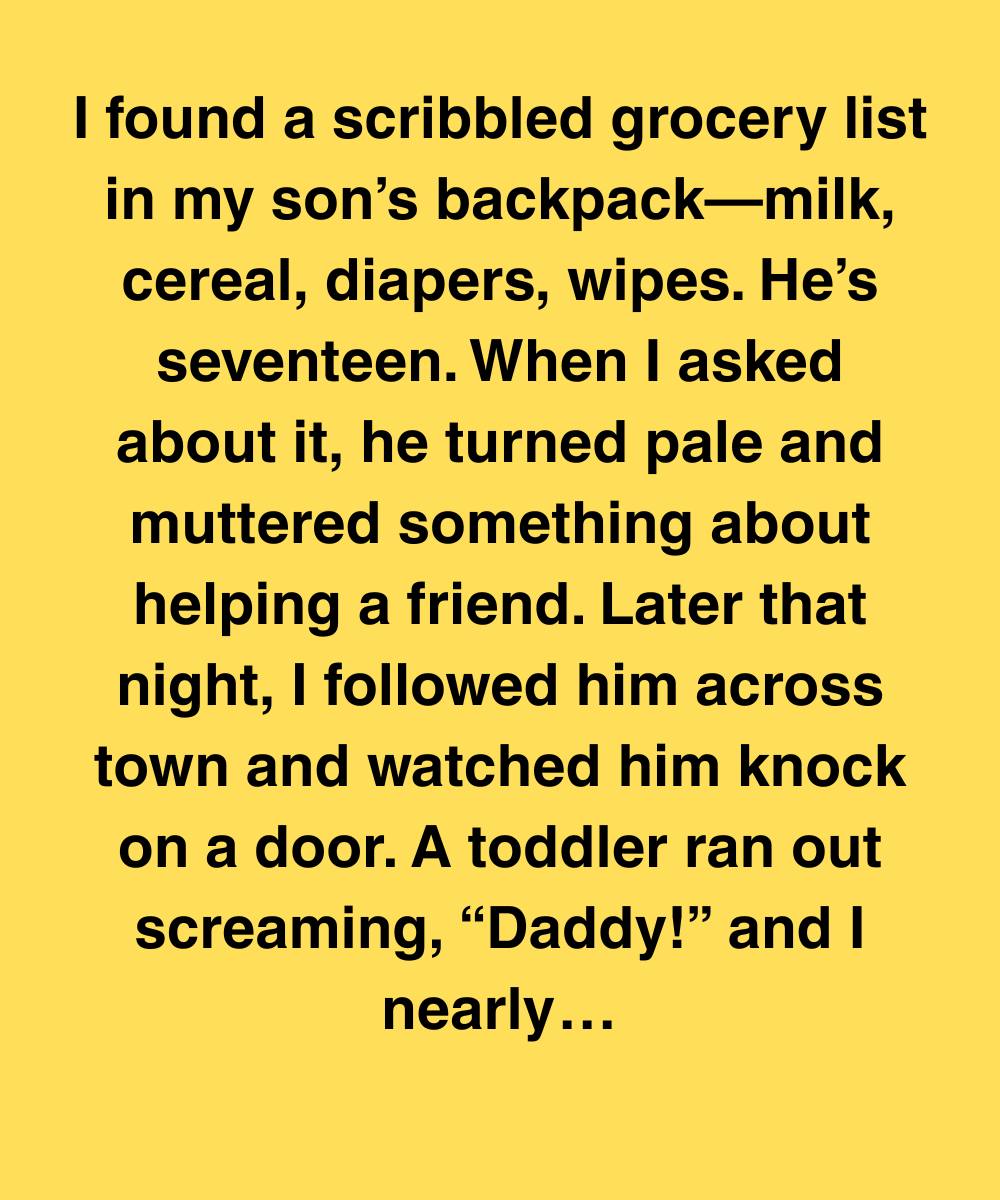I found a scribbled grocery list in my son’s backpack—milk, cereal, diapers, wipes. He’s seventeen. When I asked about it, he turned pale and muttered something about helping a friend. Later that night, I followed him across town and watched him knock on a door. A toddler ran out screaming, “Daddy!” and I nearly fell off the curb.