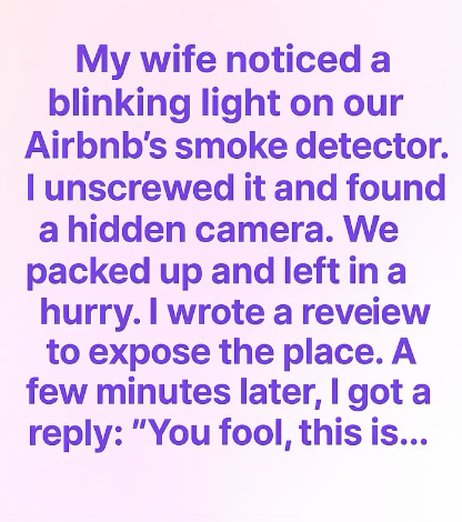 My wife noticed a blinking light on our Airbnb’s smoke detector. I climbed up, unscrewed the cover, and froze. Inside was a tiny lens — a hidden camera. My stomach turned. Without saying a word, I grabbed our bags. We packed in minutes and drove away, hearts pounding. From a diner parking lot two towns over, I pulled out my laptop and wrote a scathing review to warn others. Minutes later, a notification popped up. The host had replied: