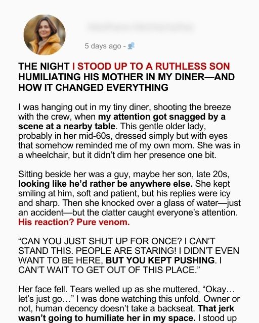 “No,” I said firmly. “Excuse her. She raised you, fed you, probably gave up more than you’ll ever know to keep you standing there in that jacket you didn’t buy. And now you think tearing her down in public makes you a man? That’s not how it works in my diner.”