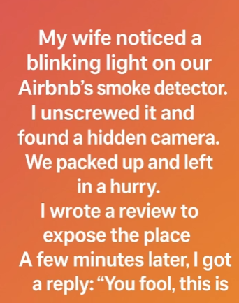 My wife noticed a blinking light on our Airbnb’s smoke detector. I unscrewed it and found a hidden camera. Heart racing, I showed her, and we packed up our belongings in a hurry, leaving immediately. We were shaken, and on the drive away, I wrote a scathing review to expose the place, warning others to stay away.