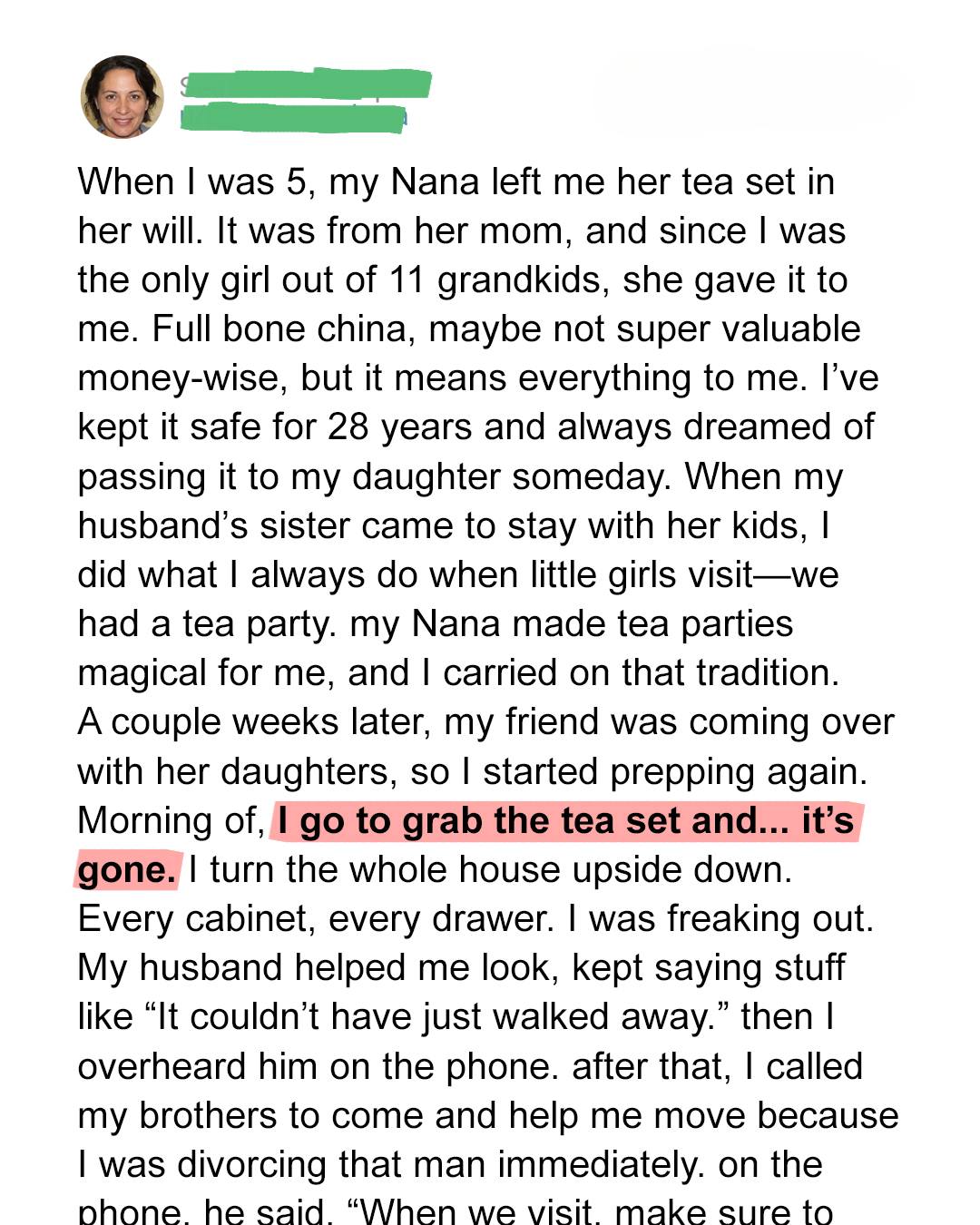 When I was five, Nana gave me her bone china tea set—delicate, hand-painted, and passed down through generations. It came with a promise: “One day, you’ll understand why this matters.” For 28 years, it traveled with me through moves, heartbreaks, and quiet afternoons where I needed her presence. Then one day, it was gone.