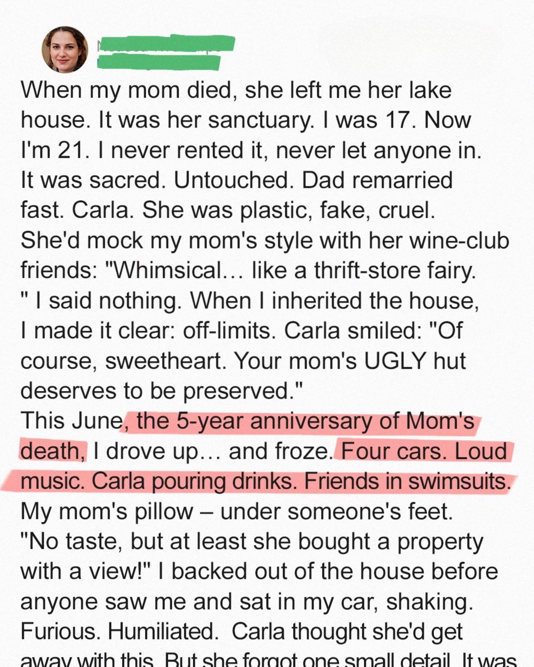 When my mom passed, she left me her most cherished possession — a serene lake house that had been her refuge. I kept it exactly as she left it, visiting only to honor her memory.My dad remarried quickly. His new wife, Carla, never hid her disdain for my mom’s “boho” style, mocking her art and lifestyle behind fake smiles. I made it clear the lake house was off-limits..