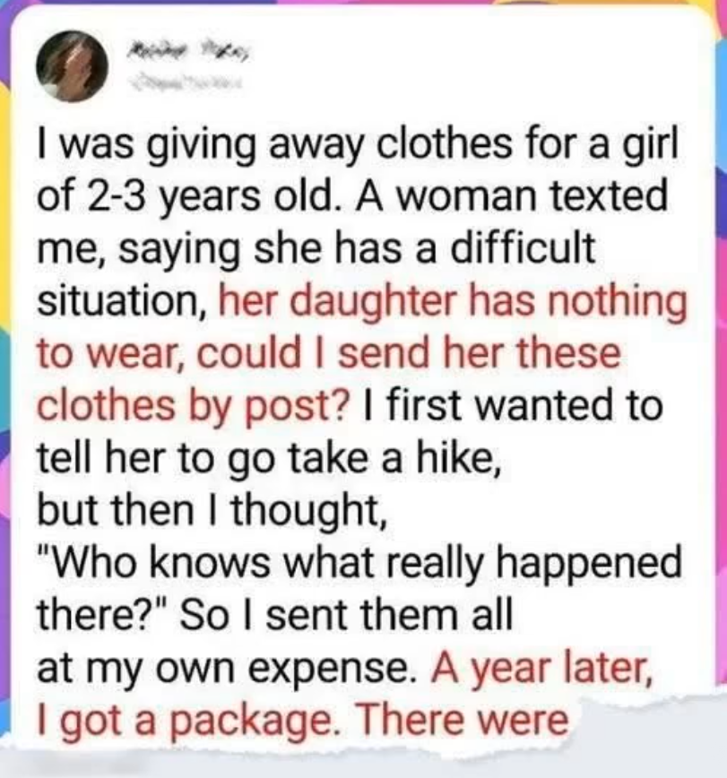 I decided to send the package, covering the shipping myself. I wrapped the clothes with care and included a note: “I hope these bring comfort and joy.” Months passed, and I almost forgot. Then, nearly a year later, a small box arrived. Inside was a letter and photos of a smiling little girl wearing