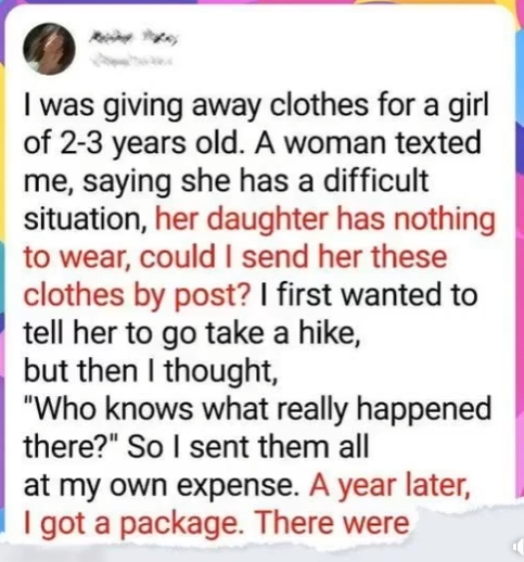Months passed, and life moved on. Then, a year later, a package arrived at my doorstep. Confused, I opened it and found a neatly folded set of clothes — the very ones I had sent, along with a heartfelt note. The woman explained that her situation had improved. She’d found a job, and now she wanted to pass the kindness forward by returning the clothes so another child could benefit.