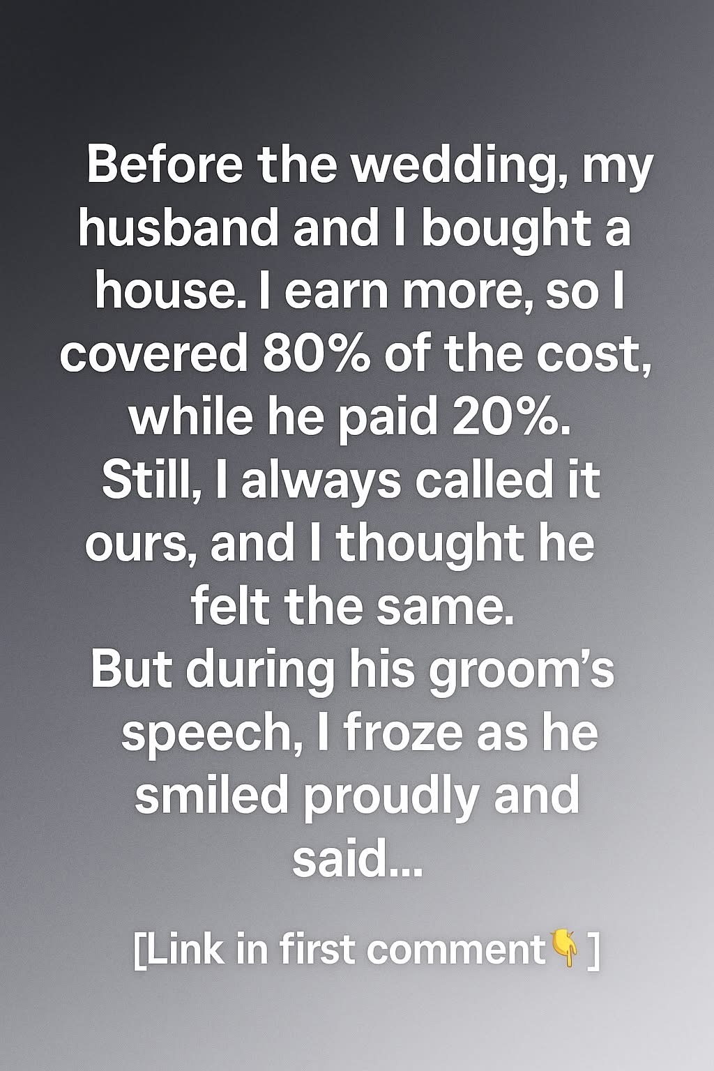 Before the wedding, my husband and I bought a house. I earn more, so I covered 80% of the cost, while he paid 20%. Still, I always called it ours, and I thought he felt the same. But during his groom’s speech, I froze as he smiled proudly and said…“…I’m so grateful to have a…