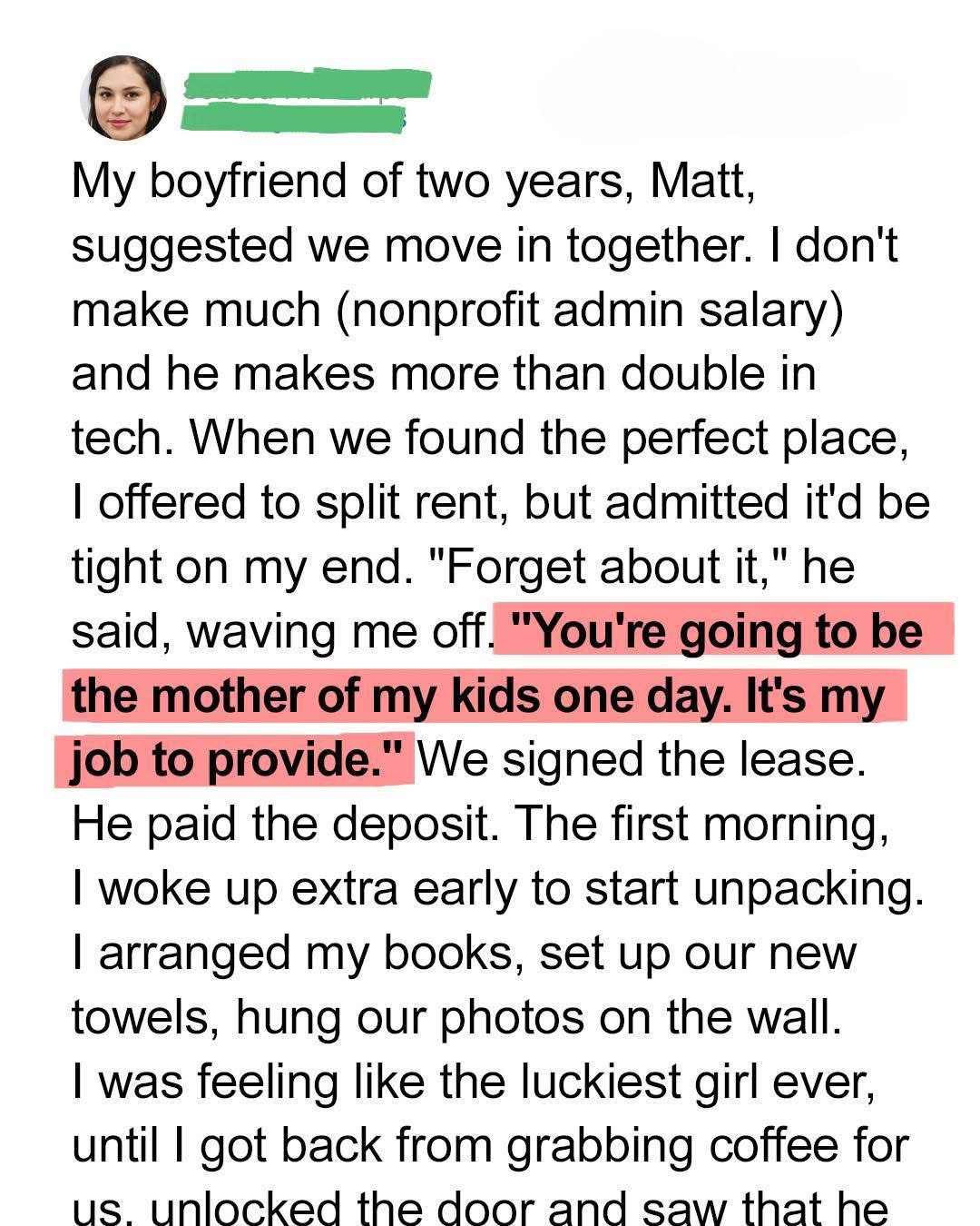 When Matt offered to pay our entire rent, I thought it was the sweetest gesture. He said he wanted to take care of me, and after nearly two years of dating, moving in together felt like the perfect next step. At first, I was relieved — my nonprofit job barely covered expenses, while his remote tech career made money less of a worry. I imagined cozy nights, lazy weekends, and a home built together.