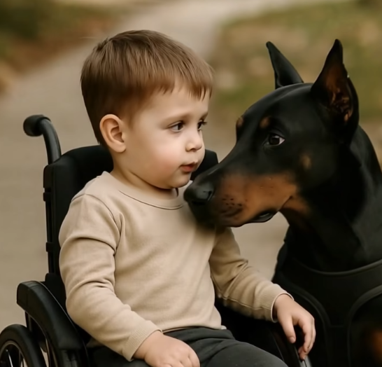 On a quiet afternoon in a small village, a young boy sat peacefully in his wheelchair near the garden. Unable to move freely because of paralysis, he often found comfort in the presence of his loyal Doberman, who never left his side. The bond between them was extraordinary—the dog seemed to sense the boy’s needs even before anyone else could.