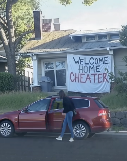 I thought I had the perfect marriage, until small clues—lipstick stains, perfume on Tim’s clothes—made me question what was really happening. I doubted myself, but then one day I stepped outside and saw a huge banner hanging across our porch with hurtful words aimed at my husband. Neighbors had surely seen it, and the humiliation cut deep.
