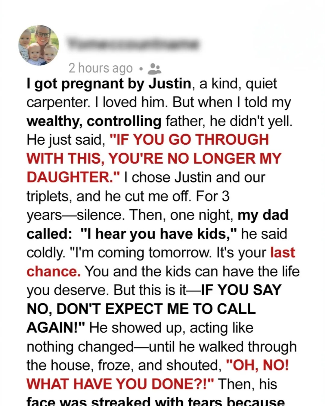 Those first months were tough. Lucas and I moved into his small house and worked hard to make ends meet. When we found out we were expecting triplets, our world turned upside down. Sleepless nights, endless diapers, and constant worries filled our days, but we supported each other through it all. Slowly, Lucas’ carpentry business grew, and we built a modest but happy life together. For the first time, I felt truly proud of what we’d accomplished.