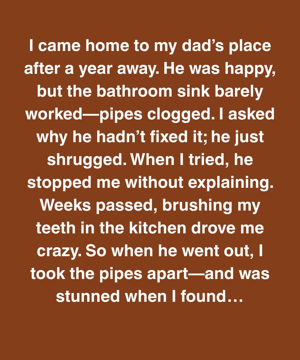 I came home to my dad’s place after a year away. He was happy, but the bathroom sink barely worked—pipes clogged. I asked why he hadn’t fixed it; he just shrugged. When I tried, he stopped me without explaining. Weeks passed, brushing my teeth in the kitchen drove me crazy. So when he went out, I took the pipes apart—and was stunned when I found a small velvet pouch stuffed deep inside the U-bend.