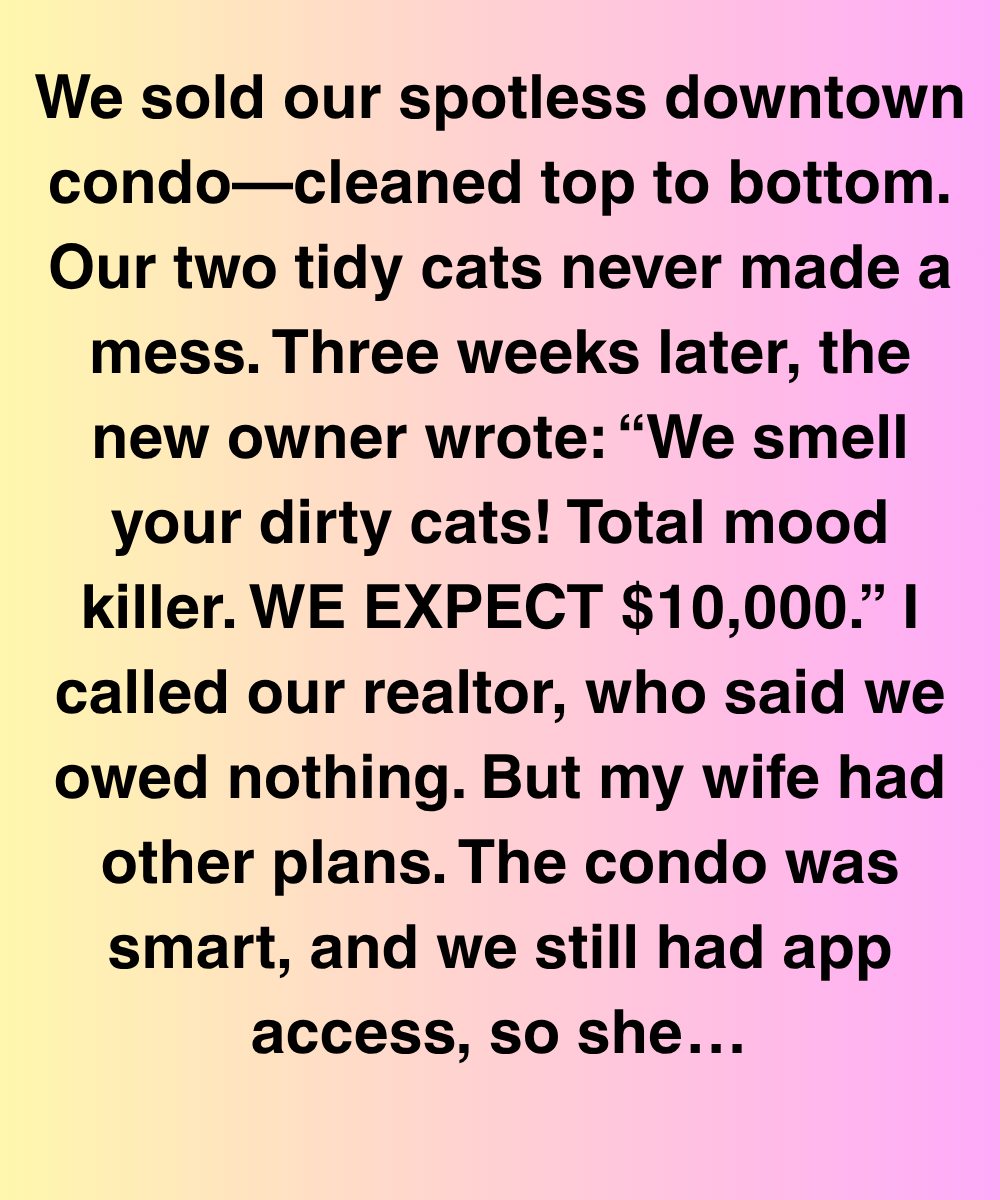 We sold our spotless downtown condo—cleaned top to bottom. Our two tidy cats never made a mess. Three weeks later, the new owner wrote: “We smell your dirty cats! Total mood killer. WE EXPECT $10,000.” I called our realtor, who said we owed nothing. But my wife had other plans. The condo was smart, and we still had app access, so she logged in, turned off the lights, then flashed them like a disco strobe. She adjusted the thermostat to freezing, then boiling. We heard back almost instantly: “What’s going on with the climate control? The lights won’t stay on!” My wife giggled like a kid who’d just pulled a perfect prank. I told her it was risky, but she shrugged. “He threatened us first.”
