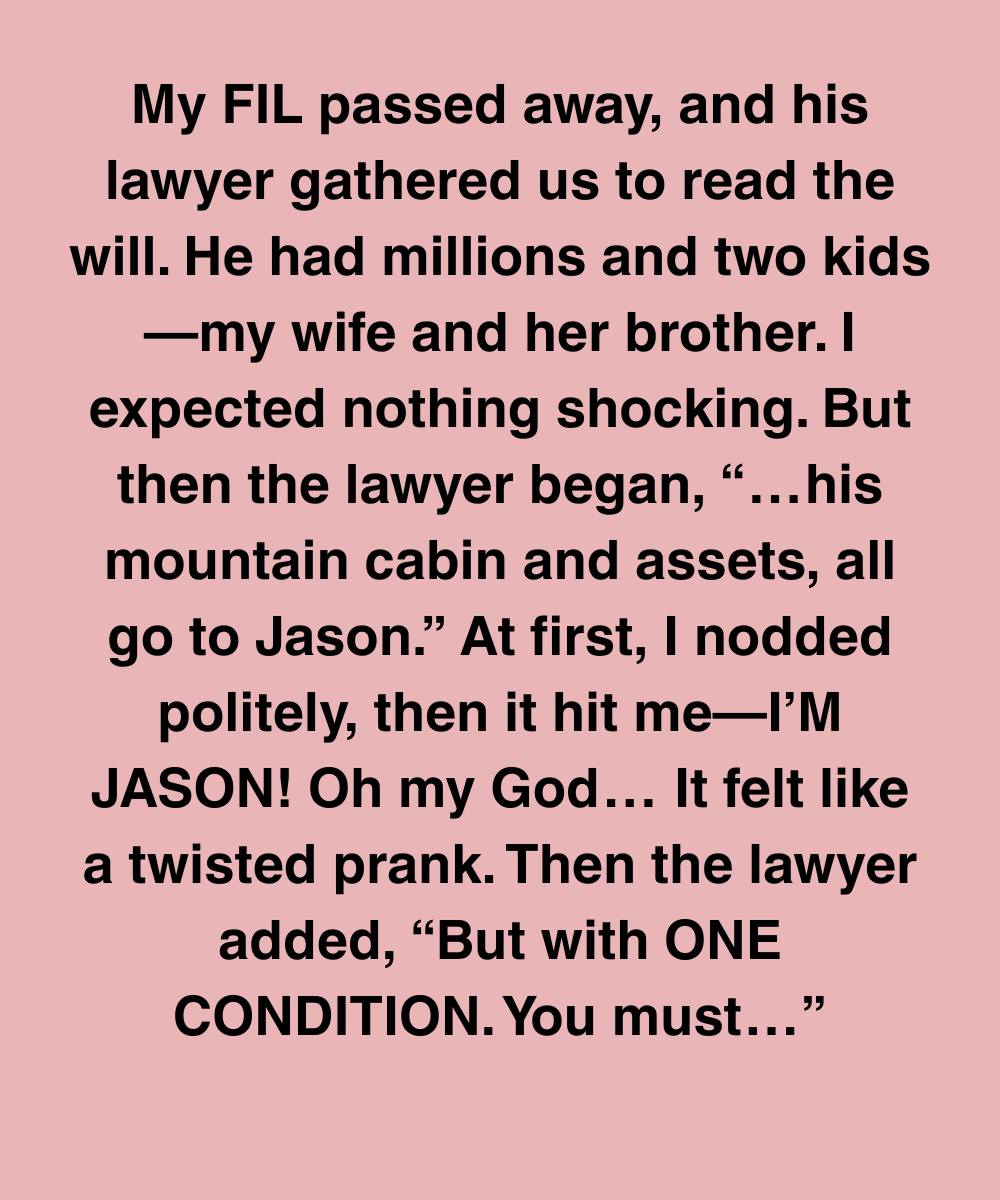 My father-in-law passed away, and his lawyer gathered us to read the will. He had millions and two kids—my wife, Rina, and her brother, Orson. I expected nothing shocking. But then the lawyer began, “…his mountain cabin and assets, all go to Jason.” At first, I nodded politely, then it hit me—I’M JASON! Oh my God… It felt like a twisted prank. Then the lawyer added, “But with ONE CONDITION. You must live in the mountain cabin for one full year. Alone.”