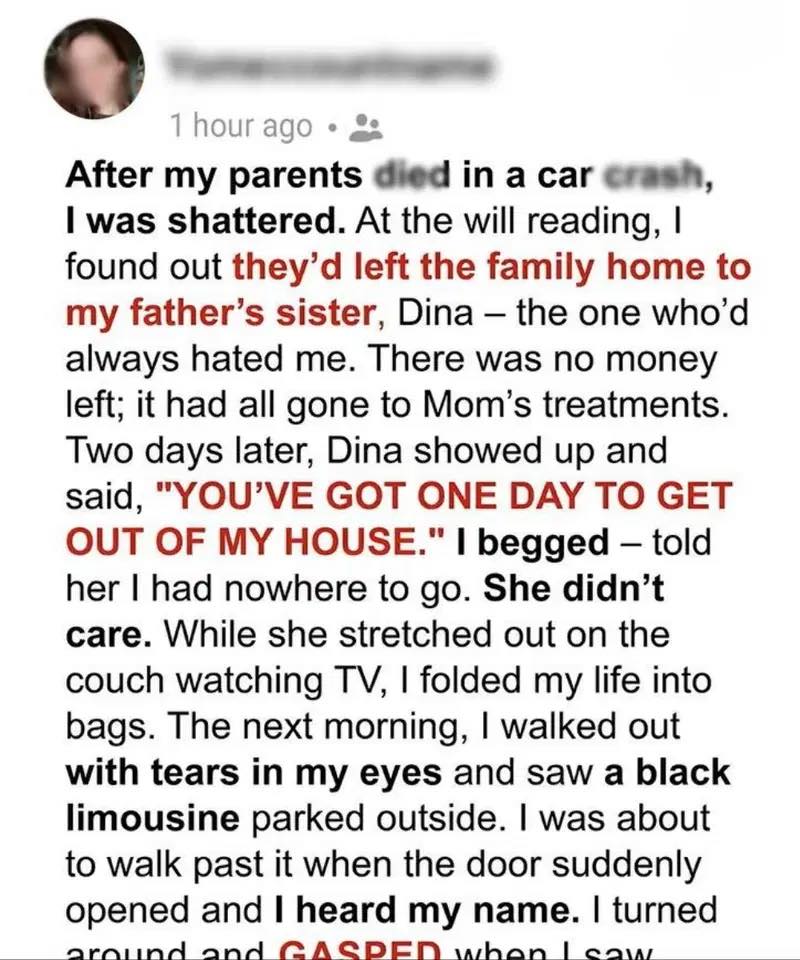 Things worsened when my Aunt Dina, who had scarcely been present in our lives, turned up for the will reading. To my surprise, the house was reportedly left to her.