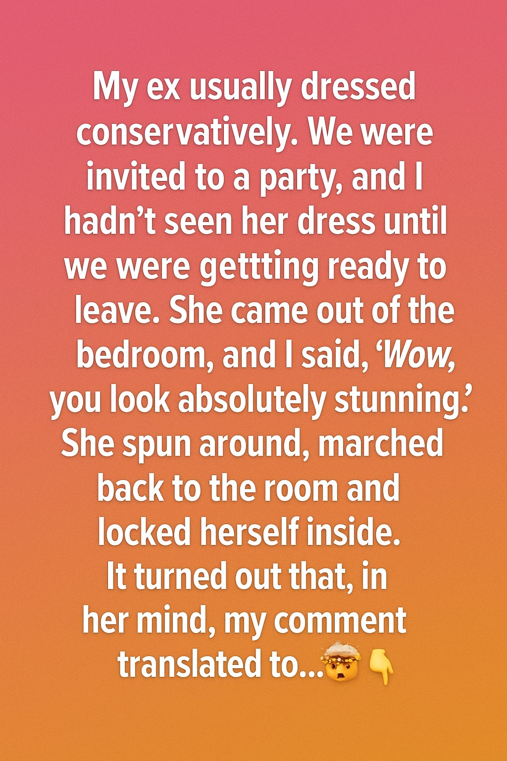 At first, I was confused. I thought I’d done the right thing — complimenting her, making her feel special. But after a few minutes of silence, I gently knocked on the door and asked what was wrong. Her voice came back, shaky and upset: “You never say that. So if you’re surprised now, it means I don’t usually look good to you.”