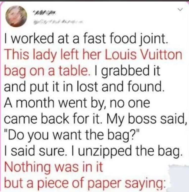 I used to work at a small fast-food restaurant in town. One evening, a customer accidentally left a beautiful Louis Vuitton bag on one of the tables. It was clearly something valuable, so I quickly picked it up and placed it in our lost and found, hoping the owner would return soon. Days turned into weeks, and no one ever came back to claim it. After a month, my manager asked me if I wanted to keep the bag since it had been unclaimed for so long.