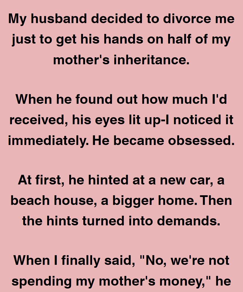 My husband decided to divorce me just to get his hands on half of my mother’s inheritance. When he found out how much I’d received, his eyes lit up—I noticed it immediately. He became obsessed. At first, he hinted at a new car, a beach house, a bigger home. Then the hints turned into demands. When I finally said, “No, we’re not spending my mother’s money,” he snapped, “Then we should get a divorce.” Why? To claim part of it. But here’s the twist—my mom saw it coming. You should’ve seen his face when she made me sign a prenup that covered inheritances years before she passed.